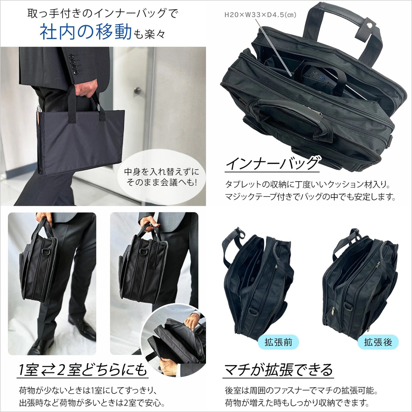 ・2室構造で荷物の仕分けがしやすくマチ幅を広げられる拡張機能付き 通勤から出張まで幅広く活躍