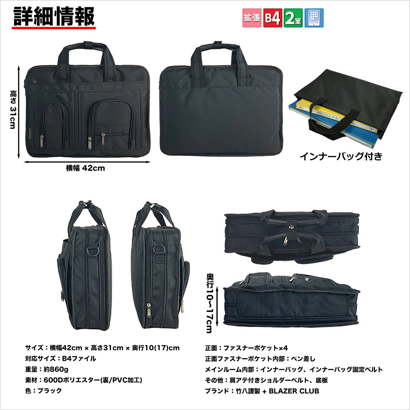 竹八謹製 (タケハチ) ノートPC対応 ビジネスバッグ B4対応 マチ幅拡張機能付き 通勤 出張用 900g + ケーブルバンド2個セット tn0704