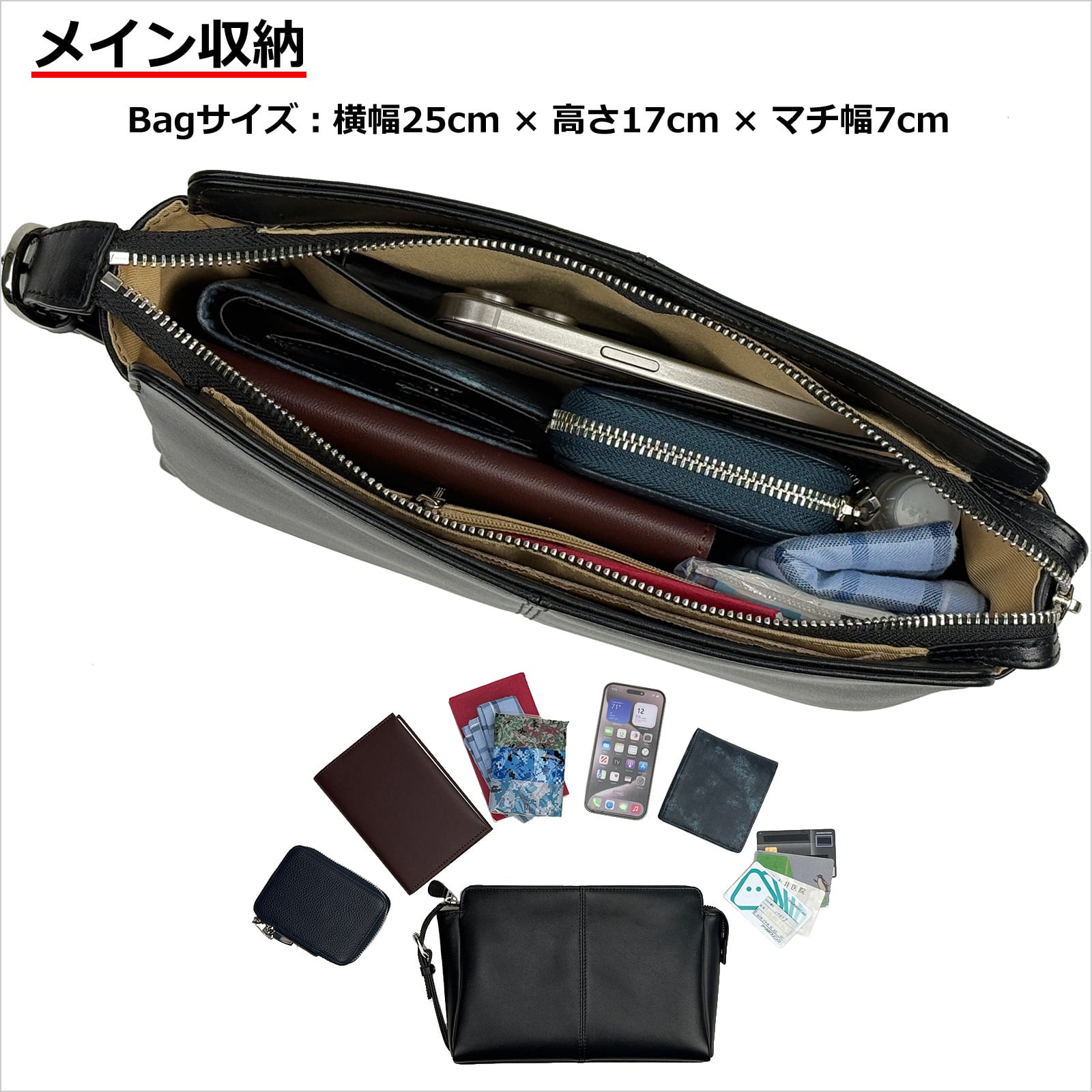 ▪️ 本体内部:ファスナーポケット、オープンポケット、カード入れ